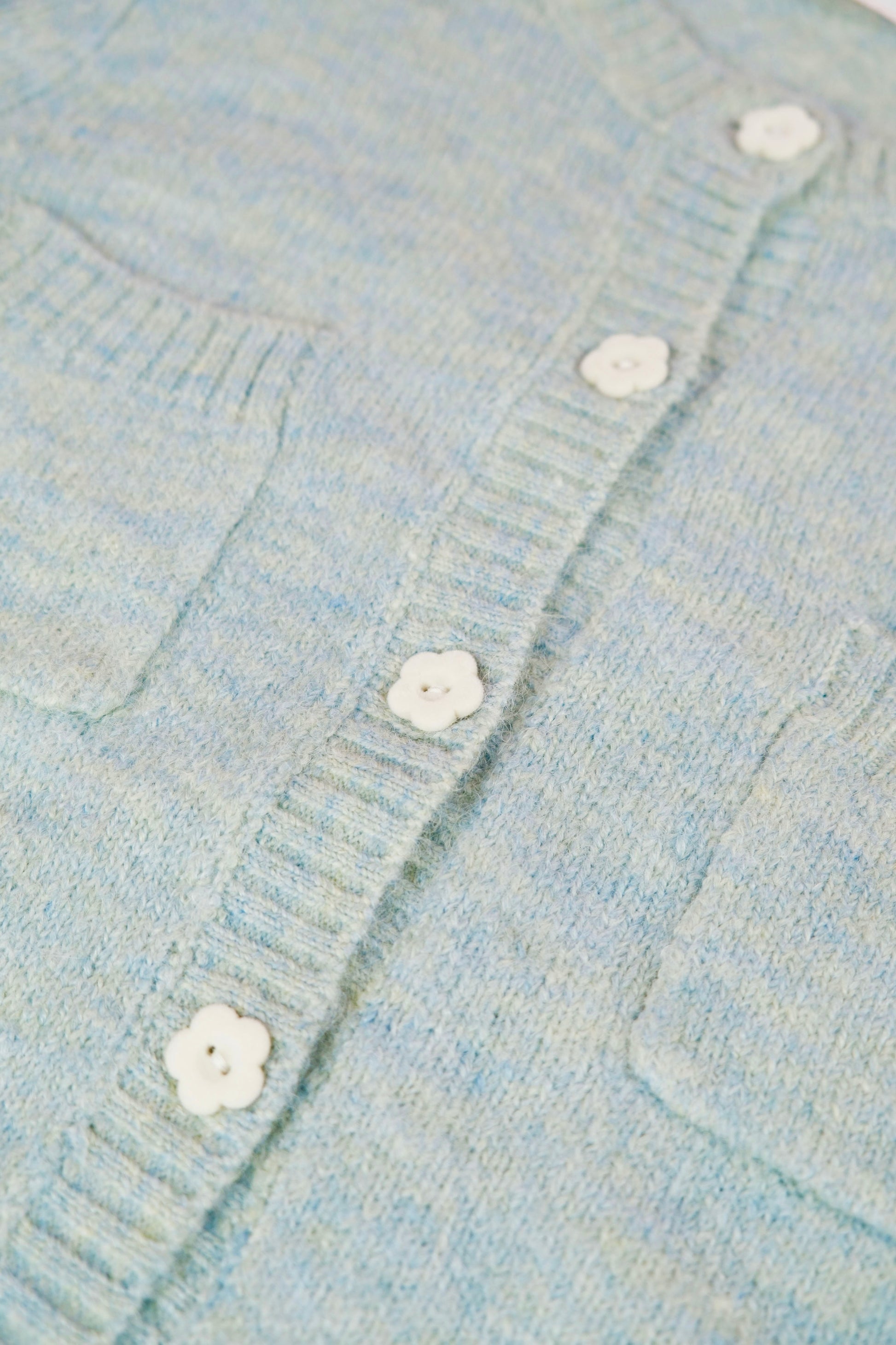 Design Details: Knitted craftsmanship; round neckline; button-front cardigan style; long sleeves; two-piece set with distressed detailing; casual style suitable for daily wear