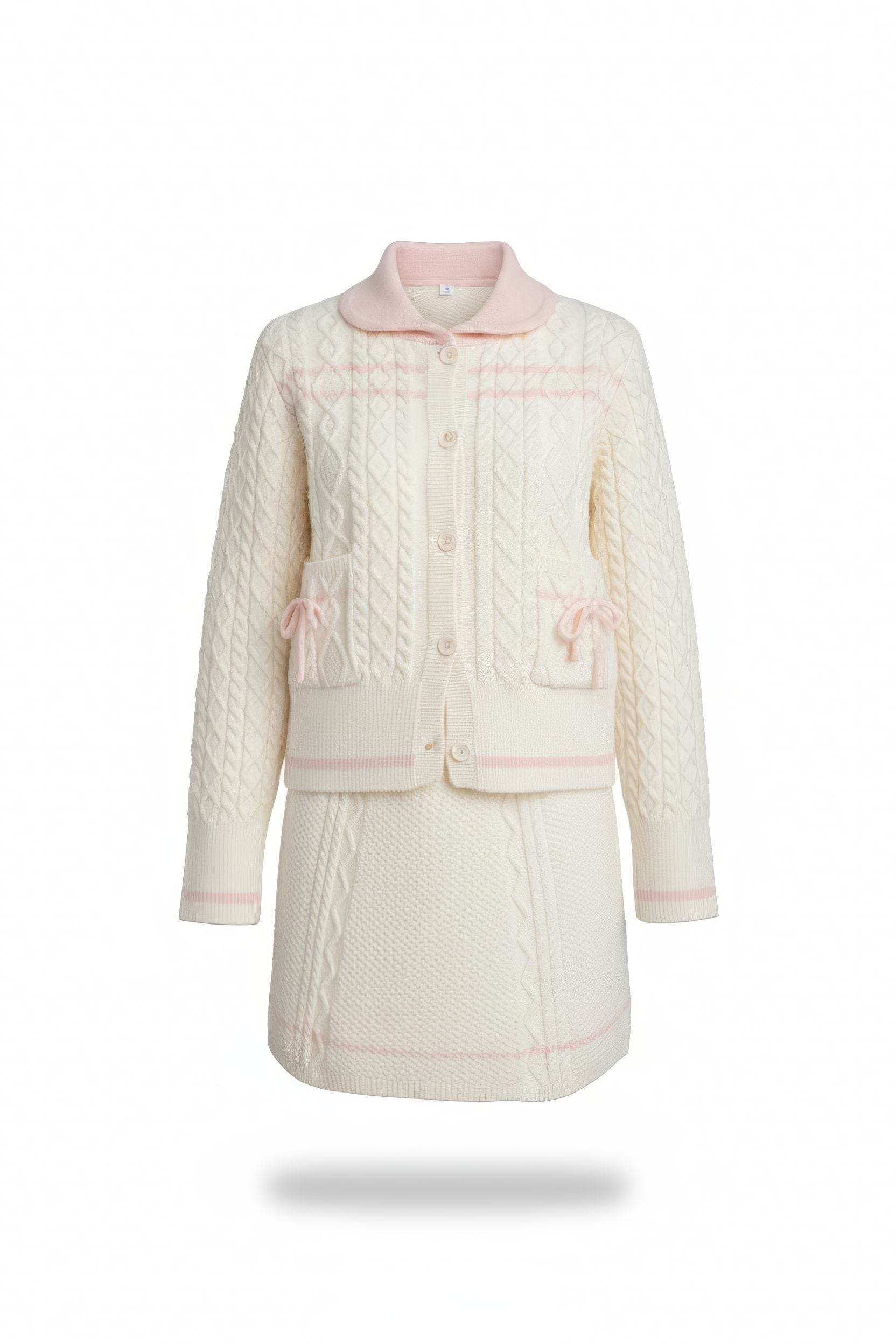 Design Details: Two-piece set with doll collar top and cable-knit skirt; turn-down collar; long sleeves; button-front closure